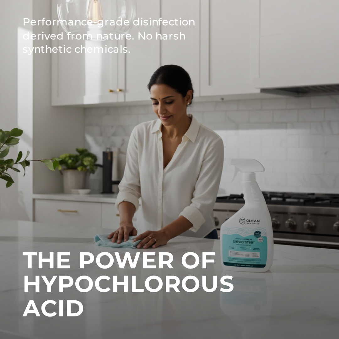 Hypochlorous acid (HOCl) is a naturally occurring compound your immune system produces every day. When your white blood cells fight infection, HOCl is the chemical they use. It’s one of the most effective natural antimicrobials known to science. We make it the same way your body does — through electrolysis of salt and water. The result is a powerful cleaning and disinfecting solution with zero synthetic chemicals.