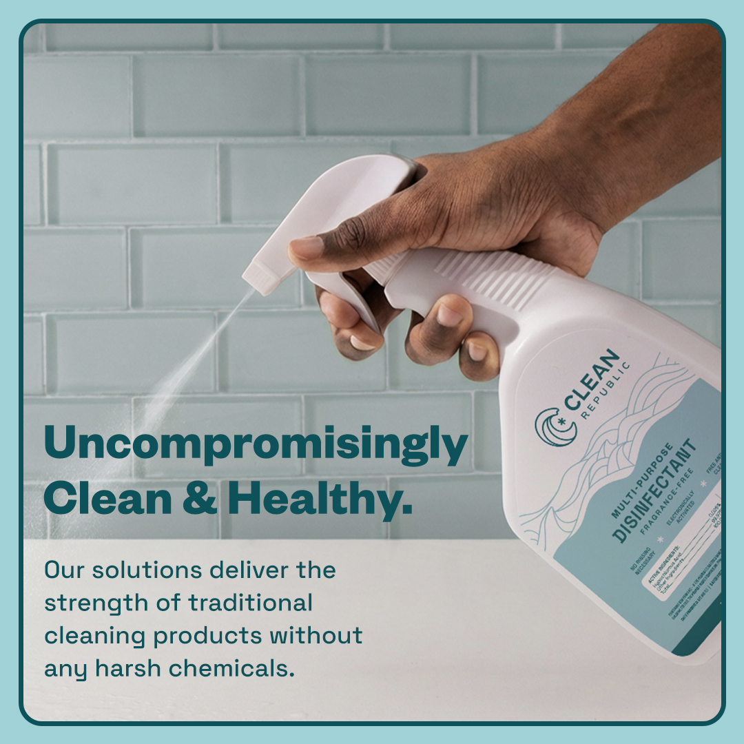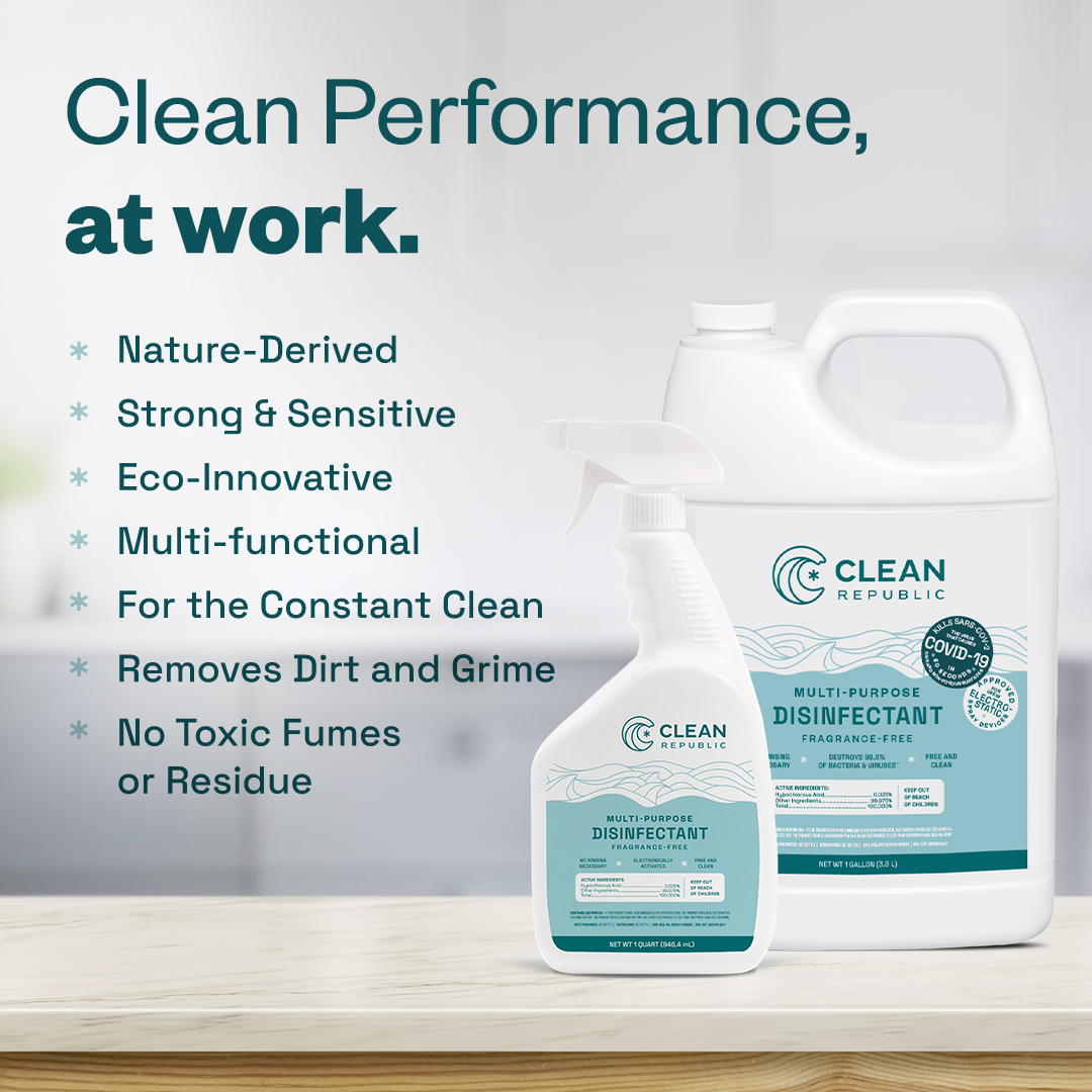 Multi-Purpose Disinfectant kills 99.9% of viruses and bacteria without the harsh chemicals and toxic fumes found in traditional cleaning products. This performance-grade cleaning solution is powered by nature’s super ingredient, hypochlorous acid (HOCl).